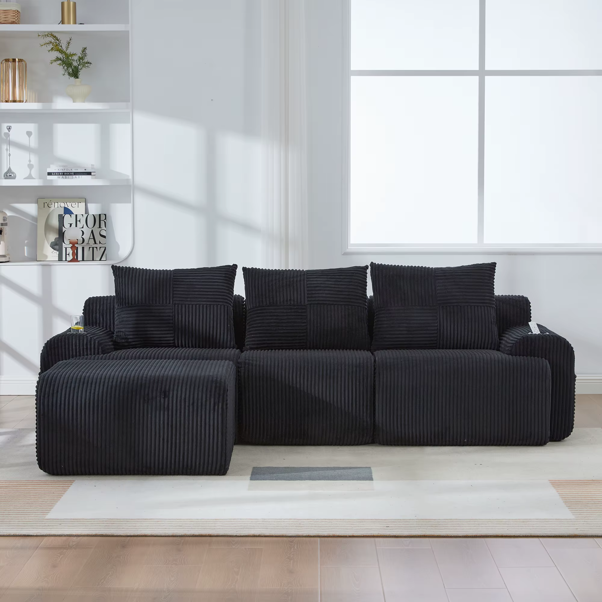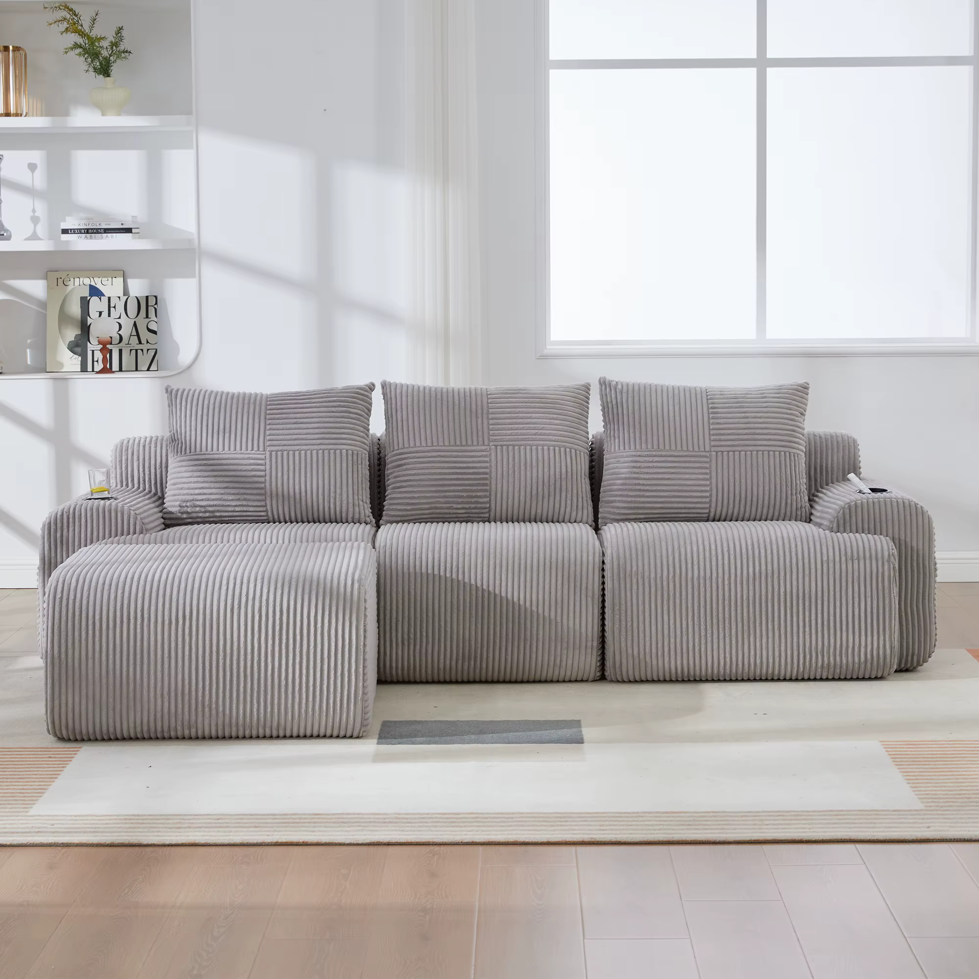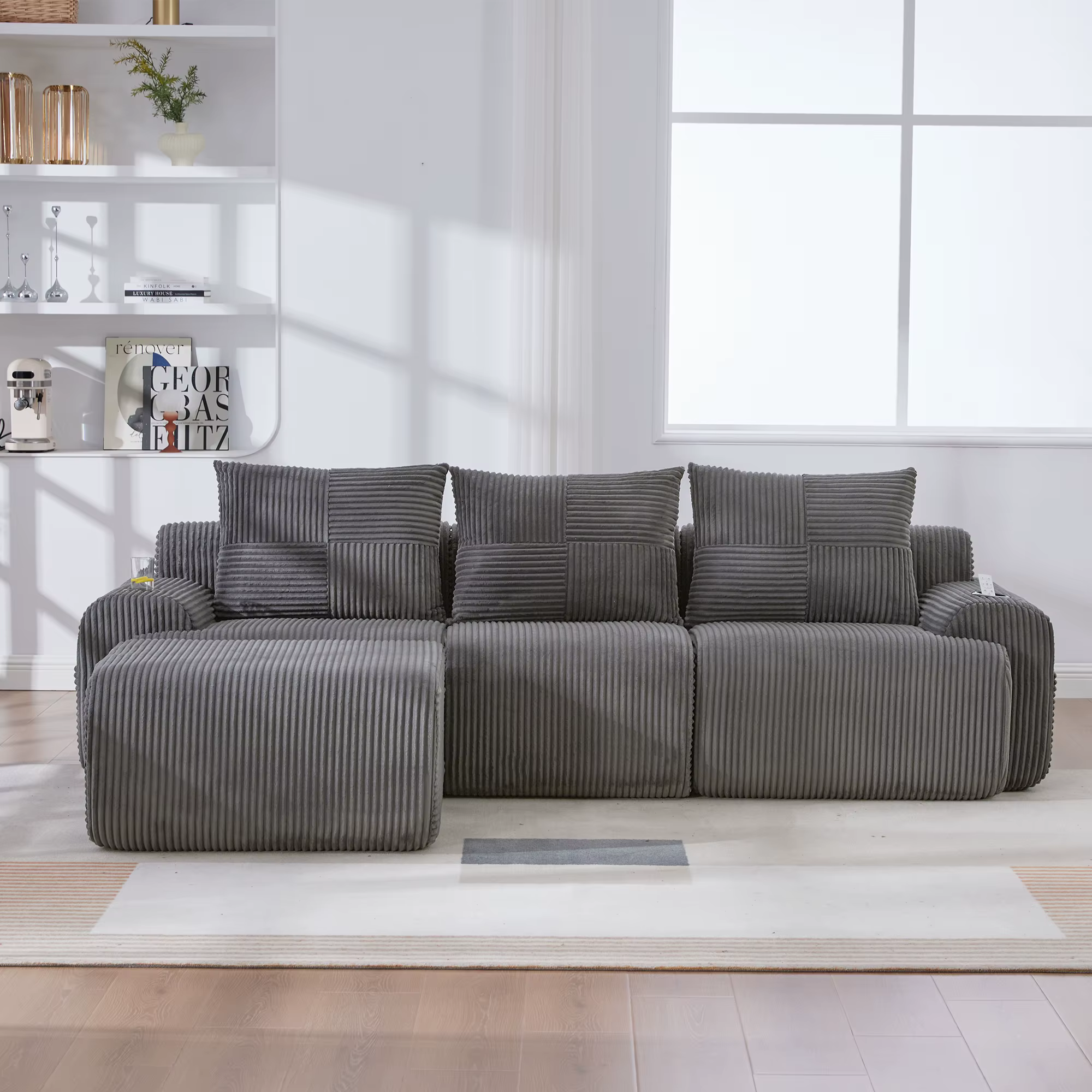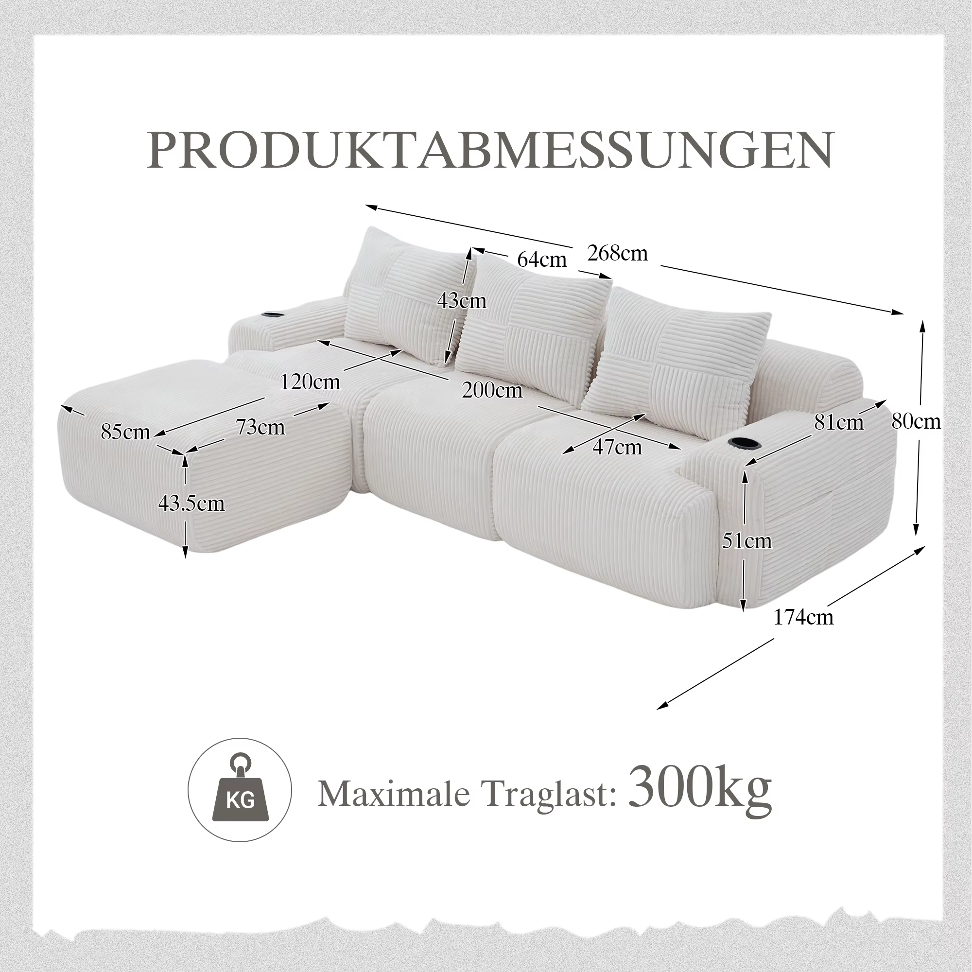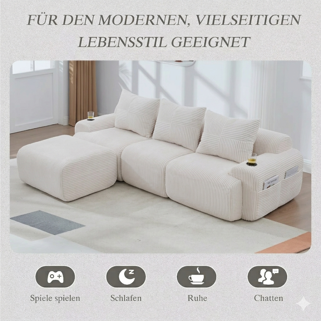 Verwandle dein Wohnzimmer in eine VIP-Lounge. Dank des ergonomischen Designs finden hier alle die perfekte Position. Das weiche Cord-Gewebe sorgt für ein luxuriöses Hautgefühl bei jedem Filmabend.